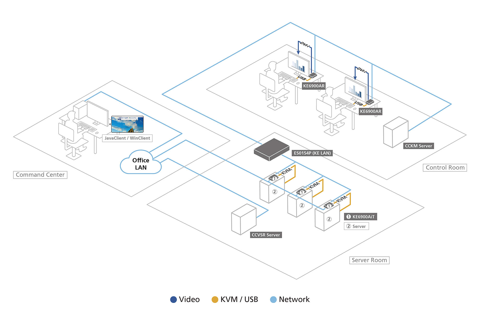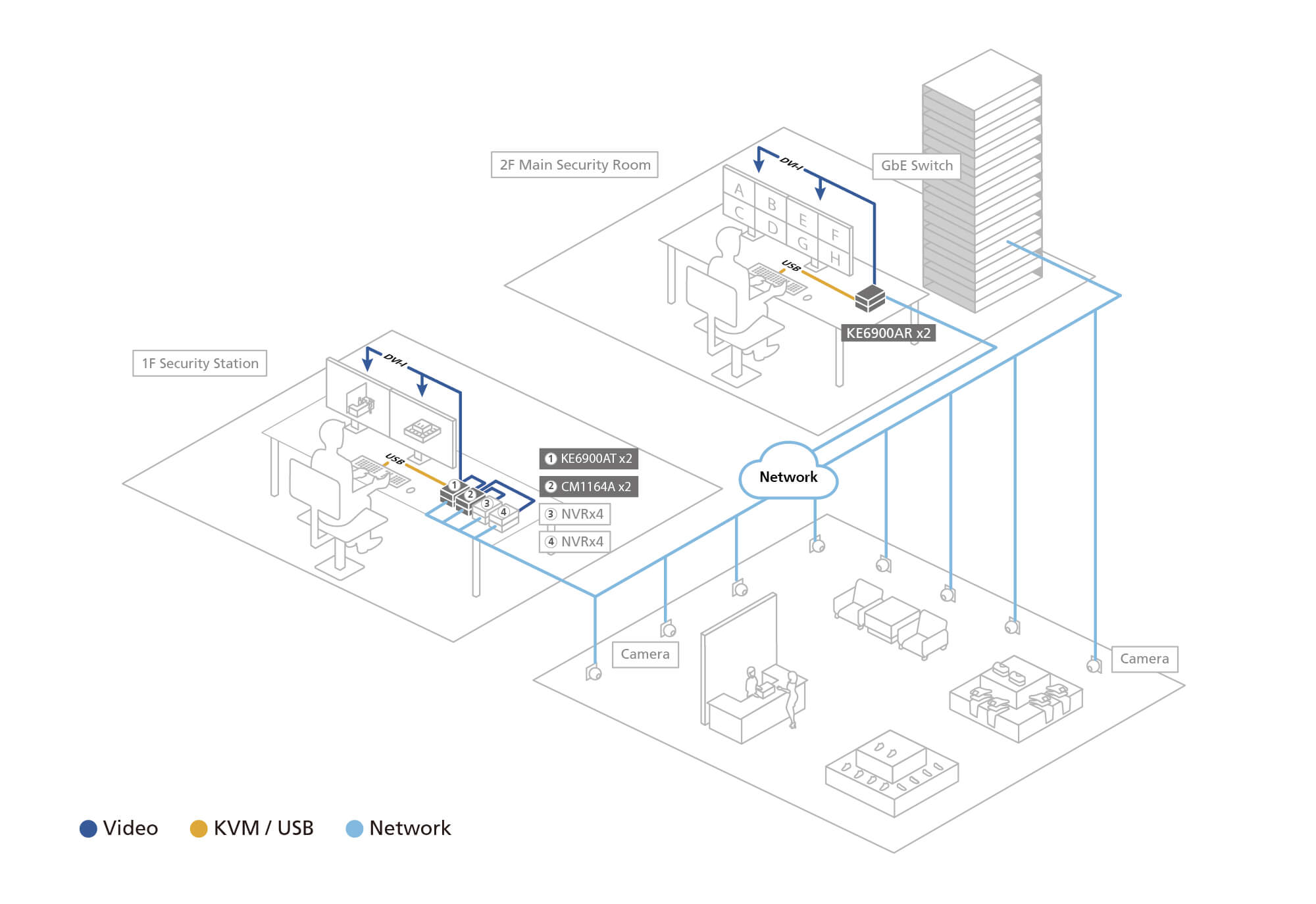 La combinación de switches KVMP™ multi-view (serie CM) y el sistema de matrices KVM sobre IP (serie KE) tiene como objetivo ofrecer flujos de vídeo combinados extendidos a través de la red. Estos flujos se envían a la sala de control de vigilancia principal para realizar una monitorización cómoda con una latencia ultrabaja, y tienen como objetivo eliminar las limitaciones de compatibilidad de los sistemas de vigilancia, así como permitir a los operadores tener un acceso instantáneo y seguro, tanto a nivel local como remoto.