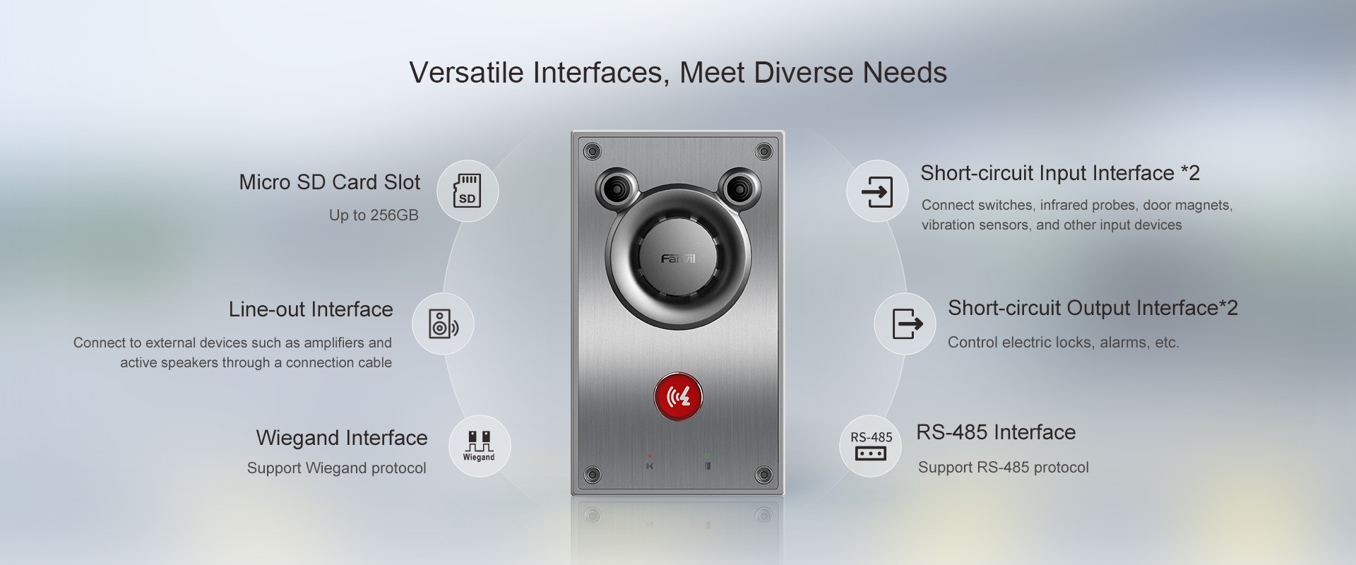 El intercomunicador de audio Fanvil A12 es un dispositivo completamente nuevo que cuenta con un altavoz incorporado de 10 W y un diseño único de cámara de sonido turbo, que ofrece un rendimiento de audio impresionante. Utiliza la avanzada tecnología de reducción de ruido de doble micrófono de Fanvil y algoritmos de mejora de voz, lo que garantiza una captura de audio clara incluso en entornos ruidosos. Además, combina un panel de acero inoxidable con una estructura de aleación de aluminio integrada, lo que lo hace no solo estéticamente agradable, sino también resistente a la corrosión y adecuado para diversos entornos hostiles.