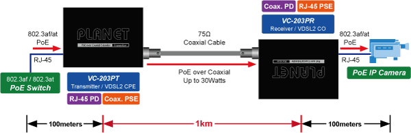 La serie VC-203Px de extensores PoE sobre coaxial de PLANET está diseñada para extender la transmisión Ethernet IP e inyectar energía a través de un cable coaxial existente a una distancia de hasta 1000 m (3280 pies) a una cámara IP PoE, un punto de acceso inalámbrico PoE y cualquier dispositivo alimentado (PD) compatible con 802.3af/at.