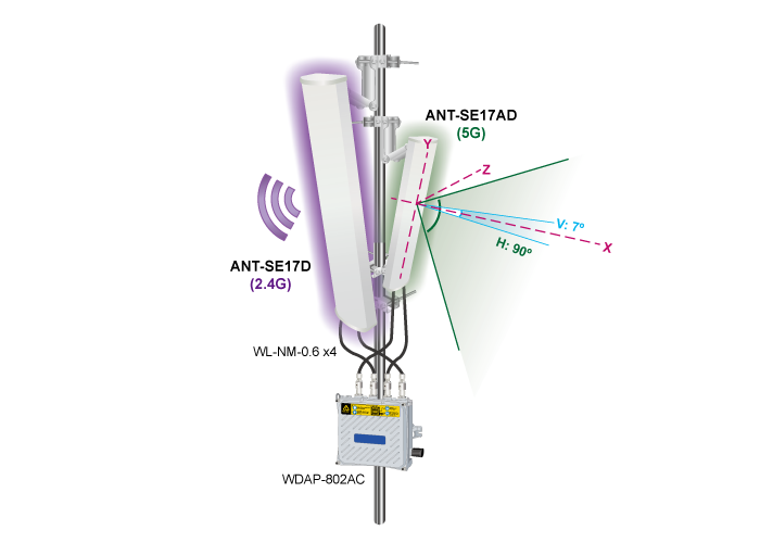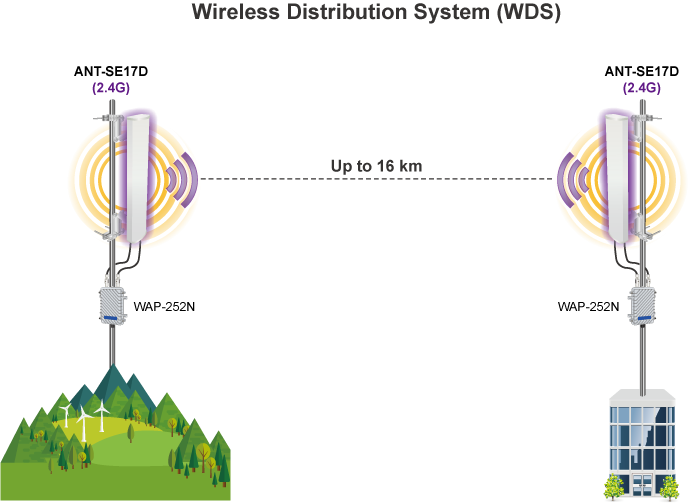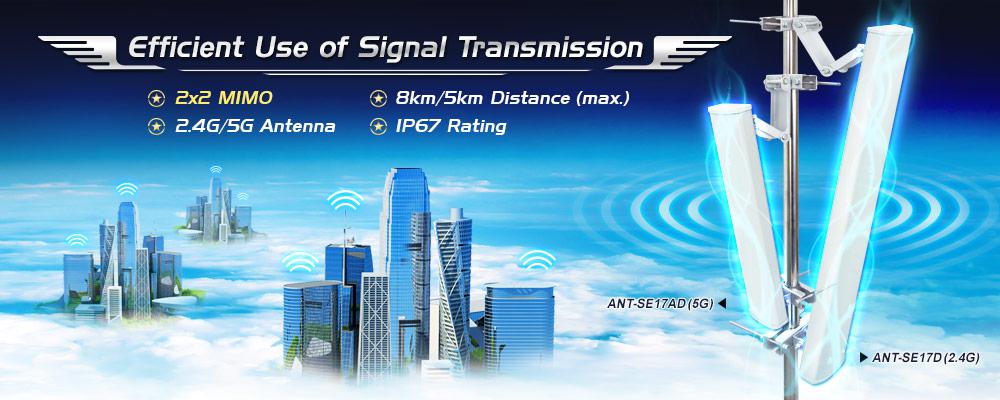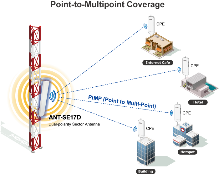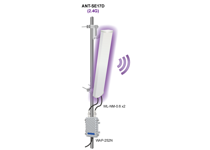 Como la ANT-SE17D puede mejorar de manera efectiva el rendimiento y la cobertura del entorno 802.11n de 2,4 GHz, también es bastante adecuada para aplicaciones LAN inalámbricas exteriores, como la conexión punto a punto entre almacenes.