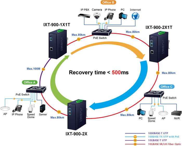 El IXT-900-2X1T admite la tecnología de anillo redundante basada en software y cuenta con una capacidad de autorrecuperación rápida y sólida para evitar interrupciones e intrusiones externas. Incorpora la tecnología avanzada ITU-T G.8032 ERPS (conmutación de protección de anillo Ethernet), que garantiza una rápida autorrecuperación en redes de anillo. Con esta característica avanzada, el tiempo de recuperación del enlace de datos puede ser de hasta 500 ms.