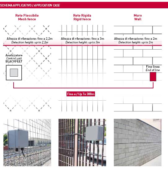 Gracias a la simple calibración de los interruptores giratorios a bordo, el cable detecta la escalada y los intentos de rotura cuando se despliega en cercas rígidas o de malla o se instala en paredes. Blackfeet Plus difiere de sistemas de cable similares en el diseño del sensor, que se configura como un par de conductores trenzados de alta calidad inmersos en tubos de silicona, que vibran dentro de un campo magnético estático. El cable del sensor está revestido de polímero resistente a los rayos UV para proporcionar la mayor protección contra la degradación con el tiempo.