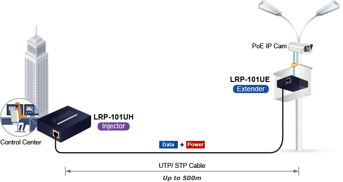 El LRP-101UH transmite datos y energía a través de un cable UTP/STP al LRP-101UE, que puede ubicarse a una distancia de hasta 500 m. Luego entregará los datos y la energía con un máximo de hasta 25 vatios a un PoE PD a través de un cable Ethernet, acelerando así la red de vigilancia IP o la infraestructura LAN inalámbrica a larga distancia. Ambos productos vienen en una carcasa de metal compacta pero resistente. Su diseño de montaje en pared se adapta fácilmente a cualquier ubicación con espacio limitado.