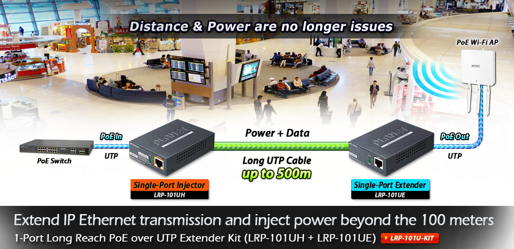 El LRP-101U-KIT, una solución PLANET Long Reach PoE, es un kit extensor PoE sobre UTP de un solo puerto que ofrece transmisión de datos y energía de largo alcance para una distancia de hasta 500 m (1640 pies) a través de un cable UTP/STP y otros 100 m a través de un cable Ethernet a una cámara IP PoE remota, un punto de acceso inalámbrico PoE o sistemas de control de acceso compatibles con PoE 802.3af/at. El LRP-101U-KIT proporciona una aplicación punto a punto para una operación plug-n-play sencilla y una implementación en entornos con exigencias climáticas con un amplio rango de temperaturas de -20 a 70 grados C. Sin el problema de la fuente de alimentación, hace que la instalación de dispositivos remotos alimentados por PoE sea más fácil y eficiente.