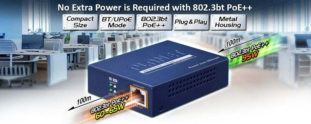 PLANET POE-E301 es un extensor simple que extiende la distancia de transmisión de datos Gigabit Ethernet y de alimentación por Ethernet IEEE 802.3bt/802.3at/802.3af a través del cable UTP Cat. 5/5e/6 estándar de 100 m (328 pies) a 200 m, 300 m, 400 m y un máximo de 400 m. El POE-E301 puede obtener una potencia PoE máxima de 95 vatios desde el puerto de entrada PoE++ 802.3bt y el puerto de salida puede suministrar una potencia máxima de 65 vatios, lo que proporciona una solución simple para lograr aplicaciones de red de cobertura más amplia sin necesidad de un adaptador de alimentación externo.