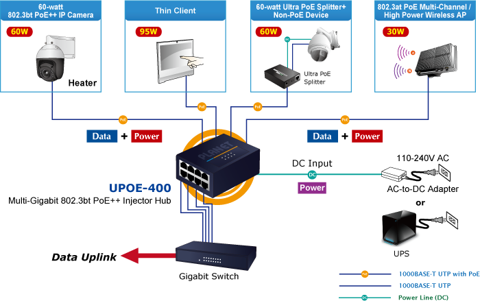 Como el UPOE-400 adopta el estándar IEEE 802.bt PoE++ y la tecnología PoH, es capaz de generar hasta 90 vatios de potencia utilizando los cuatro pares de cableado Ethernet Cat5e/6 estándar para suministrar energía y datos a máxima velocidad a cada dispositivo remoto compatible con PoE. Posee el triple de capacidad de potencia, en comparación con el PoE+ 802.3at convencional. Es una solución ideal para satisfacer la creciente demanda de dispositivos remotos con mayor consumo de energía, como: