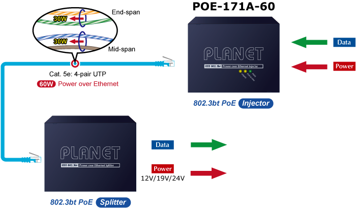 En lugar de suministrar energía a través de UTP trenzado de 2 pares, ya sea en el extremo (pines 1, 2, 3 y 6) o en el medio (pines 4, 5, 7 y 8), el POE-171A-60 brinda la capacidad de suministrar hasta 60 vatios de energía mediante el uso de los cuatro pares de cableado Ethernet estándar Cat. 5e/Cat. 6.