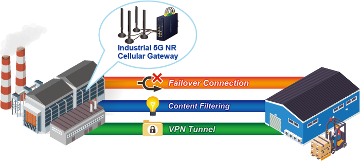 Diseñado con 5G NR e interfaces WAN duales (fibra y cobre), 1000X SFP y Gigabyte Ethernet, el ICG-2515FW-NR garantiza la conectividad a Internet al contar con una funcionalidad de conmutación por error entre 5G NR y WAN dual. El ICG-2515FW-NR brinda flexibilidad para establecer la prioridad para la conexión 5G NR o WAN dual. Cuando falla la interfaz WAN principal, la interfaz WAN secundaria respaldará automáticamente la conexión para garantizar una conectividad permanente.