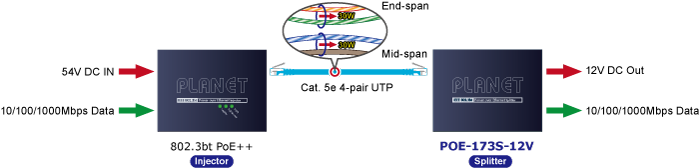 El divisor de alimentación a través de Ethernet Gigabit 802.3bt PLANET POE-173S-12V, que entrega datos digitales Ethernet y alimentación PoE desde un PSE (equipo de fuente de alimentación) PoE++ tipo 4 802.3bt a través de un cable UTP, viene con una salida de CC de 12 V, lo que permite entregar una salida de potencia máxima de 60 vatios a un dispositivo Ethernet sin alimentación PoE. Admite conexión Ethernet pasiva de 10/100/1000 Mbps y una distancia de hasta 100 metros.