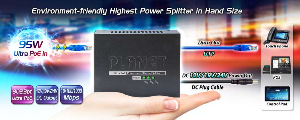 El divisor Gigabit Ultra Power over Ethernet PLANET POE-172S, que cumple con el estándar IEEE 802.3at/af y es compatible con 802.3bt, entrega datos digitales Ethernet y alimentación Ultra PoE a través de cables de par trenzado a dispositivos de red. Separa los datos digitales y la alimentación en tres salidas opcionales (12 V/19 V/24 V CC) y admite una distancia de transmisión de hasta 100 metros.