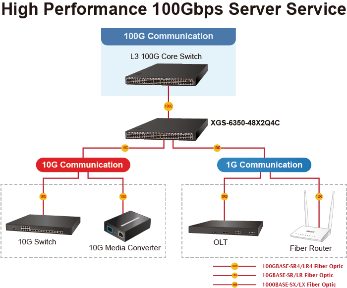 El administrador puede elegir de manera flexible los transceptores adecuados según la distancia de transmisión o la velocidad de transmisión requerida para extender la red 1G/10G/40G/100G de manera eficiente. Además, con una capacidad de conmutación de 1,92 Tbps, el XGS-6350-48X2Q4C puede manejar cantidades extremadamente grandes de datos en una topología segura que se vincula a servidores de red troncal o de alta capacidad donde se utilizan aplicaciones de audio, transmisión de video y multidifusión.
