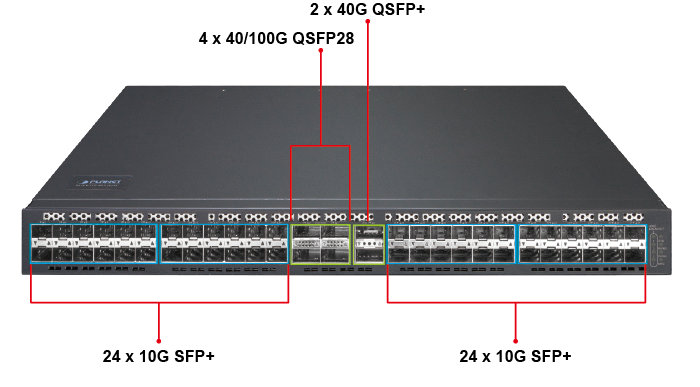 El XGS-6350-48X2Q4C proporciona cuarenta y ocho interfaces SFP+ de 10 Gbps, dos QSFP+ de 40 Gbps y cuatro interfaces de fibra QSFP28 de 100 Gbps. Cada una de las ranuras SFP+ admite Dual Speed, 10GBASE-SR/LR o 1000BASE-SX/LX y cada una de las ranuras QSFP28 admite los modos nativos 100 Gigabit Ethernet, 40G y 4 x 10 Gigabit Ethernet. Por lo tanto, el administrador puede elegir de forma flexible el transceptor SFP adecuado no solo en función de la distancia de transmisión, sino también de la velocidad de transmisión requerida. La distancia se puede ampliar de 550 metros a 2 km (fibra multimodo) o hasta 10/20/30/40/50/70/120 km (fibra monomodo o fibra WDM). Son muy adecuados para aplicaciones dentro de los centros de datos y distribuciones empresariales.