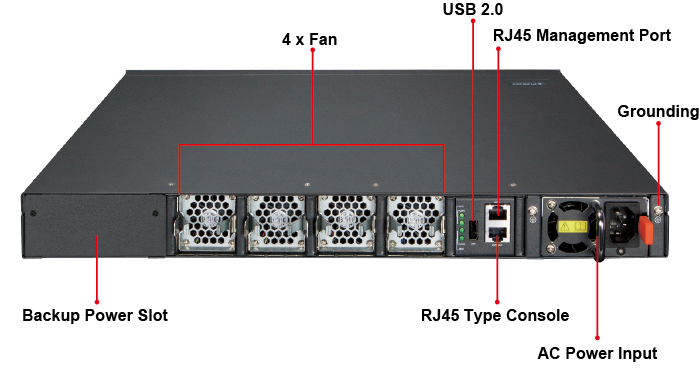 El XGS-6350-48X2Q4C está equipado con una unidad de fuente de alimentación extractiva de 100~240 V CA, por lo que es fácil reemplazar la energía para los usuarios. Además, el XGS-6350-48X2Q4C reserva otra ranura de alimentación de respaldo en el panel trasero donde se puede agregar una segunda fuente de alimentación CA o CC para convertirlo en una fuente de alimentación redundante. El sistema de alimentación redundante está diseñado específicamente para manejar las demandas de instalaciones de alta tecnología que requieren la máxima integridad de energía.