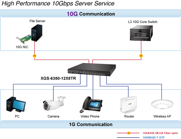 El XGS-6350-12X8TR ofrece ocho puertos Ethernet de 100/1000 Mbps y doce puertos de fibra SFP+ de 1/10 Gbps. Cada una de las ranuras SFP+ admite velocidad dual, 10GBASE-SR/LR o 1000BASE-SX/LX. Por lo tanto, el administrador puede elegir de forma flexible el transceptor SFP adecuado no solo en función de la distancia de transmisión, sino también de la velocidad de transmisión requerida. La distancia se puede ampliar de 550 metros a 2 km (fibra multimodo) o hasta 10/20/30/40/50/70/120 km (fibra monomodo o fibra WDM). Son muy adecuados para aplicaciones dentro de los centros de datos y distribuciones empresariales.