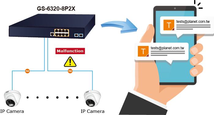 Aunque la mayoría de los software de gestión de cámaras o NVR ofrecen una función de alerta por correo electrónico SMTP, el GS-6320-8P2X proporciona además una función de alerta de evento para ayudar a diagnosticar el dispositivo anormal debido a si hay o no una interrupción de la conexión de red, pérdida de alimentación PoE o la respuesta de reinicio por el proceso PD Alive Check.