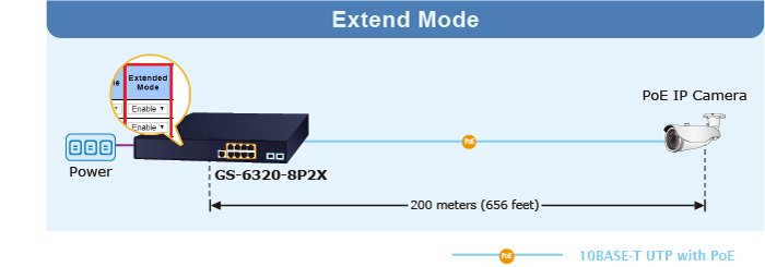 En el modo de funcionamiento "Extendido", el GS-6320-8P2X funciona por puerto a una velocidad dúplex de 10 Mbps, pero puede admitir una salida de alimentación PoE de 22 vatios a una distancia de hasta 200 metros, superando el límite de 100 m del cable UTP Ethernet. Con esta nueva función, el GS-6320-8P2X proporciona una solución adicional para la extensión de la distancia PoE 802.3at/af, ahorrando así el coste de la instalación del cable Ethernet.