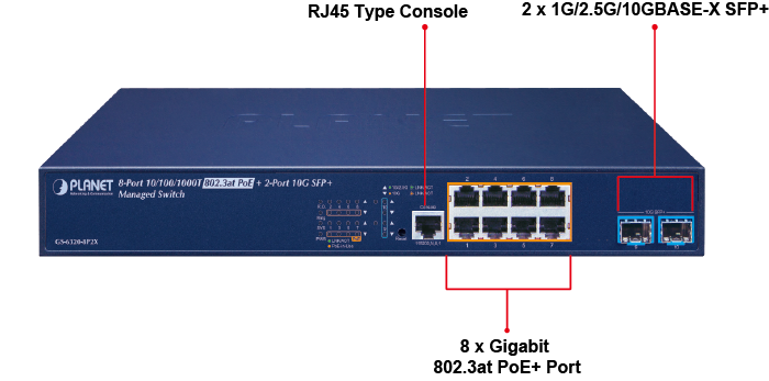 La Ethernet de 10 Gb es un gran paso en la evolución de Ethernet. Cada una de las ranuras SFP+ de 10 Gb del GS-6320-8P2X admite triple velocidad y 10GBASE-SR/LR o 2500BASE-X y 1000BASE-SX/LX. Con su capacidad de enlace Ethernet de 10 Gb y 2 puertos, el administrador ahora puede elegir de forma flexible el transceptor SFP/SFP+ adecuado según la distancia de transmisión o la velocidad de transmisión requerida para ampliar la red de manera eficiente. El GS-6320-8P2X ofrece un amplio ancho de banda y una potente capacidad de procesamiento.