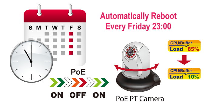 El GS-6320-8P2X permite que cada uno de los PD conectados se reinicie a una hora específica cada semana. Por lo tanto, reducirá la posibilidad de un fallo de alimentación por desbordamiento del búfer.