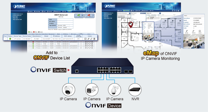 PLANET ha desarrollado recientemente una función increíble, la compatibilidad con ONVIF, que está diseñada específicamente para cooperar con videovigilancia IP. Desde la interfaz gráfica de usuario del GS-6320-24UP2T2XV, los clientes solo necesitan un clic para buscar y mostrar todos los dispositivos ONVIF a través de la aplicación de red. Además, los clientes pueden cargar imágenes de la planta a un conmutador y le permite implementar cualquier dispositivo de vigilancia para facilitar la inspección y la planificación. Además, los clientes pueden obtener información de vigilancia en tiempo real y el estado en línea/fuera de línea, y también permite el control de reinicio PoE desde la interfaz gráfica de usuario.