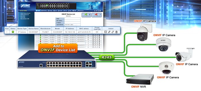El GS-6322-24P4X es compatible con una función increíble (compatible con ONVIF), que está diseñada específicamente para funcionar con sistemas de videovigilancia IP. Desde su interfaz gráfica de usuario, los clientes solo necesitan hacer un clic para buscar y mostrar todos los dispositivos ONVIF a través de la aplicación de red. Además, los clientes pueden cargar imágenes de la planta a un conmutador y le permite implementar cualquier dispositivo de vigilancia para facilitar la inspección y la planificación. Además, los clientes pueden obtener información de vigilancia en tiempo real y el estado en línea/fuera de línea, y también permite el control de reinicio de PoE desde la interfaz gráfica de usuario.
