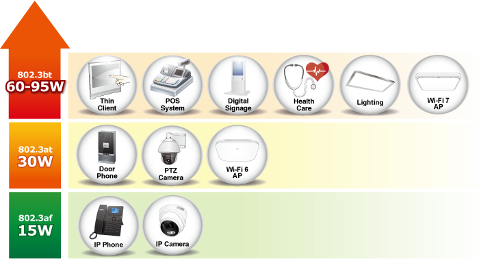 Como el GS-4210-16UP8T4X adopta la tecnología estándar IEEE 802.bt PoE++, es capaz de suministrar hasta 95 vatios de alimentación mediante el uso de los cuatro pares de cableado Ethernet Cat5e/6 estándar para suministrar alimentación y datos a máxima velocidad a cada dispositivo alimentado (PD) compatible con PoE remoto. Su capacidad de potencia es tres veces mayor que la del PoE+ 802.3at convencional y es una solución ideal para los PD de red que consumen mucha energía, como: