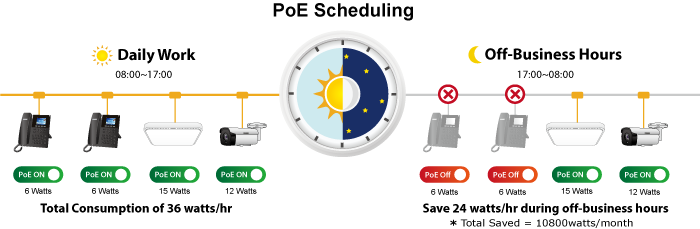 En el marco de la tendencia mundial de ahorro de energía y de la contribución a la protección del medio ambiente, el GS-4210-16UP8T4X puede controlar eficazmente la fuente de alimentación, además de su capacidad de proporcionar una gran potencia en vatios. La función “Programación PoE” le ayuda a habilitar o deshabilitar la alimentación de energía PoE para cada puerto PoE durante intervalos de tiempo específicos y es una función poderosa para ayudar a las PYMES o empresas a ahorrar energía y dinero. También aumenta la seguridad al apagar los dispositivos de almacenamiento que no deberían estar en uso fuera del horario comercial.