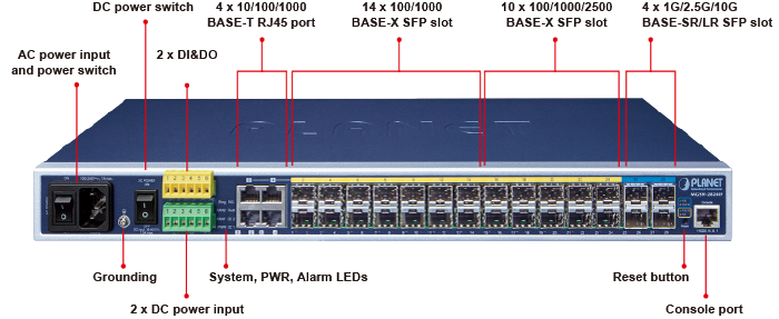 El MGSW-28240F posee una fuente de alimentación de CA de 100~240 V y una fuente de alimentación dual de CC de 36~60 V que se utiliza como fuente de alimentación redundante para garantizar su funcionamiento continuo. Su sistema de alimentación redundante está diseñado específicamente para manejar las demandas de instalaciones de alta tecnología que requieren la más alta integridad de energía. Además, con la fuente de alimentación de CC de 36~60 V implementada, el MGSW-28240F se puede aplicar como dispositivo de nivel de telecomunicaciones y colocar en casi cualquier entorno difícil.