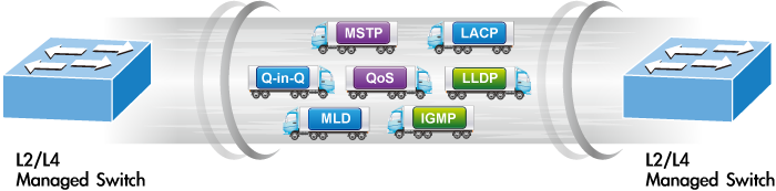 El GS-4210-24T4S y el GS-4210-24T4SR se pueden programar para funciones avanzadas de administración de conmutadores, como agregación de enlaces de puertos dinámicos, VLAN 802.1Q y VLAN Q-in-Q, protocolo de árbol de expansión múltiple (MSTP), protección de bucle y BPDU, detección de IGMP y detección de MLD. A través de la agregación de enlaces, el GS-4210-24T4S y el GS-4210-24T4SR permiten el funcionamiento de un enlace troncal de alta velocidad para combinarlo con varios puertos y también admiten conmutación por error. Además, el Protocolo de descubrimiento de capa de enlace (LLDP) es el protocolo de capa 2 incluido para ayudar a descubrir información básica sobre los dispositivos vecinos en el dominio de transmisión local.