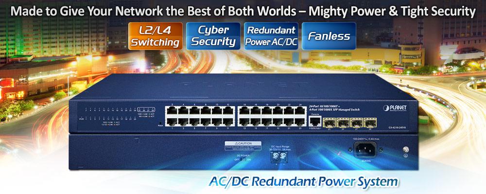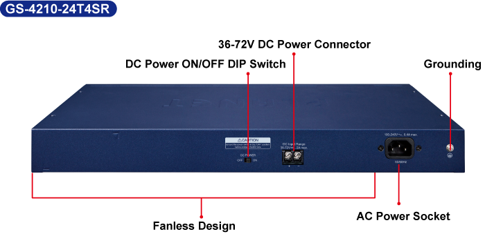 El GS-4210-24T4SR está especialmente equipado con una unidad de fuente de alimentación de CA de 100~240 V y una unidad de fuente de alimentación de CC de 36~72 V para proporcionar una fuente de alimentación redundante mejorada, confiable y escalable. El sistema de alimentación continua está diseñado específicamente para satisfacer las demandas de instalaciones de alta tecnología que requieren la máxima integridad de energía. Con una fuente de alimentación de 36~72 V CC, el GS-4210-24T4SR puede actuar como un dispositivo de nivel de telecomunicaciones que puede ubicarse en la sala electrónica.