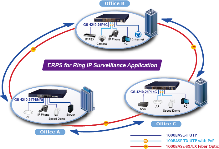 El GS-4210-24T4S(R) admite la tecnología de anillo redundante y cuenta con una capacidad de autorrecuperación rápida y sólida para evitar interrupciones e intrusiones externas. Incorpora tecnología avanzada ITU-T G.8032 ERPS (conmutación de protección de anillo Ethernet), protocolo Spanning Tree (802.1s MSTP) en la red del cliente para mejorar la confiabilidad del sistema y el tiempo de funcionamiento en varios entornos.
