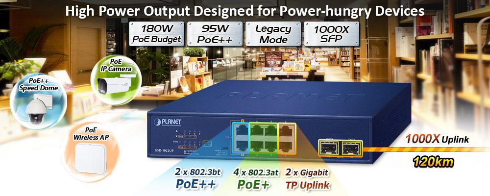 El GSD-1022UP, que cumple con la tecnología IEEE 802.3bt PoE++, proporciona hasta 95 vatios de potencia de salida PoE, triplicando la de la tecnología anterior 802.3at PoE+. El GSD-1022UP también puede ser compatible con versiones anteriores de los estándares 802.3af/at PoE para permitir a los usuarios implementar de manera flexible dispositivos estándar y de alta potencia simultáneamente sin necesidad de configuración de software. Con datos y alimentación a través de Ethernet desde una unidad, el GSD-1022UP puede reducir la instalación de cables y eliminar la necesidad de tomas de corriente dedicadas en la pared, el techo o cualquier lugar inaccesible.