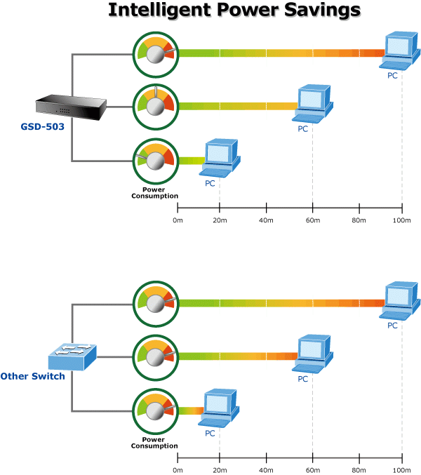 El uso inteligente de la energía utiliza un algoritmo inteligente que determina activamente el nivel de energía adecuado en función de la longitud del cable. Cuando el GSD-503 se conecta con un cable Ethernet de menos de 20 m, un dispositivo puede obtener el máximo ahorro de energía porque el GSD-503 detectará automáticamente la longitud del cable Ethernet y disminuirá el consumo de energía. El dispositivo conectado puede reducir sustancialmente el consumo total de energía, lo que contribuye significativamente al ahorro de energía.
