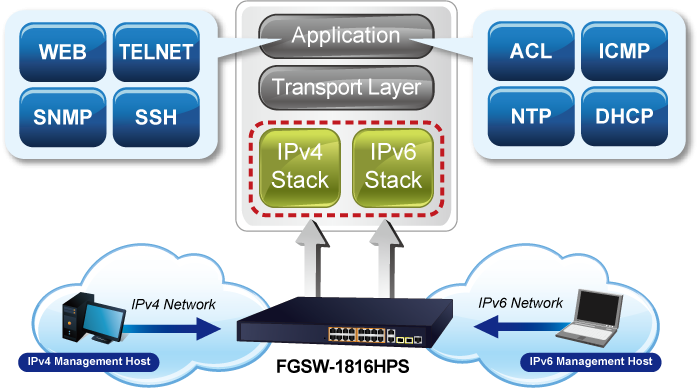 Con compatibilidad con el protocolo IPv6/IPv4 e interfaces de administración sencillas y amigables, el FGSW-1816HPS es la opción ideal para que los proveedores de servicios inalámbricos, VoIP y vigilancia IP se conecten con la red IPv6. También ayuda a las PYMES a ingresar a la era IPv6 con la menor inversión y sin tener que reemplazar las instalaciones de red, incluso si los ISP establecen la red de borde FTTx IPv6.