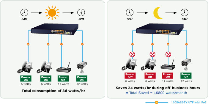 Además de utilizarse para vigilancia IP, el FGSW-1816HPS es ciertamente aplicable para construir cualquier red PoE, incluidas VoIP y LAN inalámbrica. Siguiendo la tendencia mundial de ahorro de energía y contribuyendo a la protección del medio ambiente en la Tierra, el FGSW-1816HPS puede controlar eficazmente la fuente de alimentación, además de su capacidad de proporcionar una alta potencia en vatios. La función de “programación PoE” le ayuda a habilitar o deshabilitar la alimentación de energía PoE para cada puerto PoE durante intervalos de tiempo específicos y es una función poderosa para ayudar a las PYMES y empresas a ahorrar energía y presupuesto.