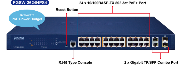 El conmutador administrado PoE+ de capa 2 FGSW-2624HPS4 de PLANET, recientemente revisado, está diseñado para empresas e industrias donde se puede administrar de forma central una red de PD. Las funciones de administración del conmutador se han mejorado para incluir administración inteligente de PoE, administración de IPv6, ACL, GVRP y más.