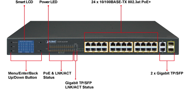 PLANET FGSW-2622VHP ofrece un panel de color intuitivo en su panel frontal que facilita la gestión de Ethernet y la gestión de PD PoE. Promueven en gran medida la eficiencia de la gestión en redes a gran escala para empresas, hoteles, centros comerciales, edificios gubernamentales y otras áreas públicas, y cuentan con las siguientes funciones especiales de gestión y estado: