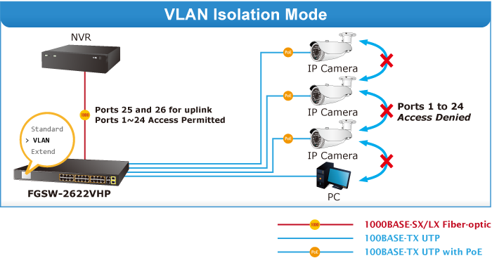 PLANET FGSW-2622VHP ofrece modos de funcionamiento Estándar, VLAN y Extendido. El FGSW-2622VHP funciona como un conmutador PoE IEEE 802.3af/at normal en el modo de funcionamiento Estándar. El modo de funcionamiento VLAN presenta la función VLAN basada en puerto que puede ayudar a evitar que la tormenta de multidifusión o difusión de la cámara IP se influya entre sí.