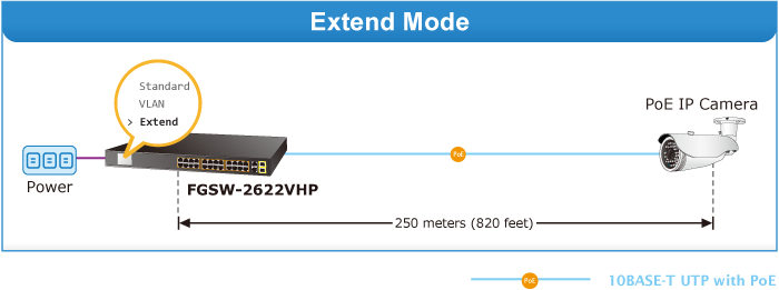 En el modo de funcionamiento Extendido, el FGSW-2622VHP funciona por puerto a una velocidad de funcionamiento dúplex de 10 Mbps, pero puede soportar una potencia de salida PoE de 20 vatios a una distancia de hasta 250 metros, superando el límite de 100 m del cable UTP Ethernet. Con esta nueva característica, el FGSW-2622VHP proporciona una solución adicional para la extensión de distancia PoE 802.3af/at, ahorrando así el coste de la instalación del cable Ethernet. Su función de aislamiento VLAN aísla los puertos para evitar tormentas de difusión y defenderse de la suplantación de DHCP en el modo de funcionamiento Extendido.