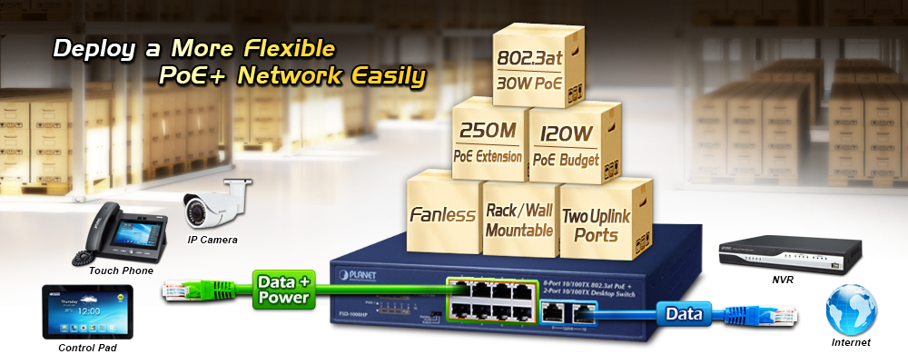 PLANET FSD-1008HP ofrece ocho puertos 10/100TX con PoE+ 802.3at de 30 vatios, un presupuesto total de PoE de 120 vatios y dos puertos de enlace ascendente adicionales para satisfacer la demanda de suficiente energía PoE para vigilancia IP HD y sistema Wi-Fi en una red de pequeña escala pero de alto rendimiento. Con la misma carcasa de metal compacta y del tamaño de un escritorio, hace que la ubicación de la unidad sea conveniente y proporciona una implementación rápida y sencilla de PD PoE con alimentación de energía.