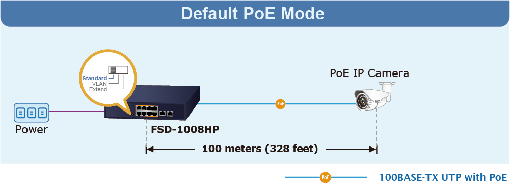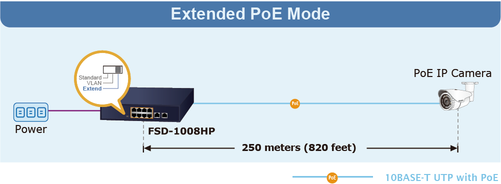 • En el modo de funcionamiento "Extend", el FSD-1008HP funciona por puerto a una velocidad de funcionamiento dúplex de 10 Mbps, pero admite una salida de potencia PoE de 30 vatios a una distancia de hasta 250 metros, superando el límite de 100 m del cable UTP Ethernet.