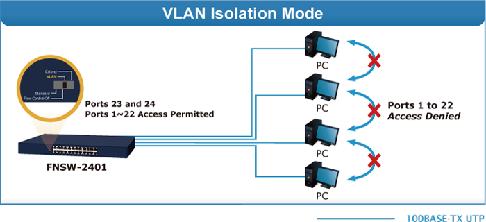 Este modo hace que el FNSW-2401 funcione como un conmutador de aislamiento de VLAN