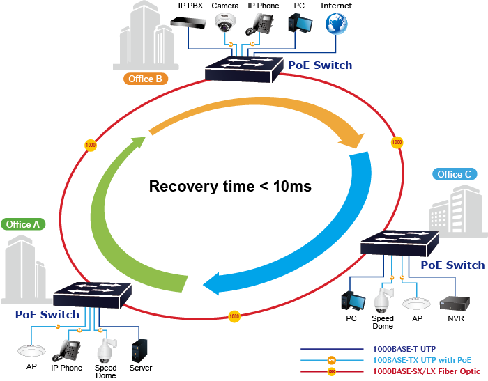 La serie GS-4210 PoE admite la tecnología de anillo redundante y cuenta con una capacidad de autorrecuperación rápida y sólida para evitar interrupciones e intrusiones externas. Incorpora tecnología avanzada ITU-T G.8032 ERPS (Ethernet Ring Protection Switching), protocolo Spanning Tree (802.1s MSTP) en la red del cliente para mejorar la confiabilidad del sistema y el tiempo de actividad en varios entornos.