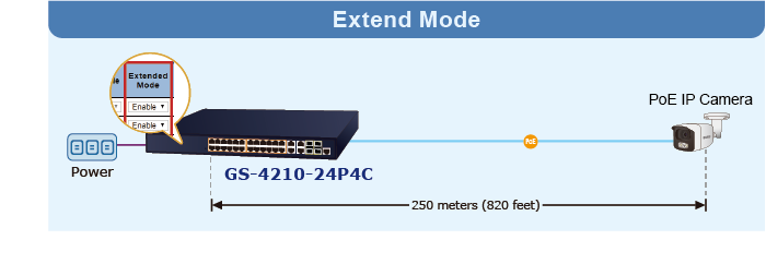 En el modo de funcionamiento "Extendido", la serie GS-4210 PoE funciona por puerto a una velocidad dúplex de 10 Mbps, pero puede admitir una salida de alimentación PoE de 30 vatios a una distancia de hasta 250 metros, superando el límite de 100 m del cable UTP Ethernet. Con esta nueva función, la serie GS-4210 PoE proporciona una solución adicional para la extensión de la distancia PoE 802.3at/af, lo que permite ahorrar el coste de instalación del cable Ethernet.