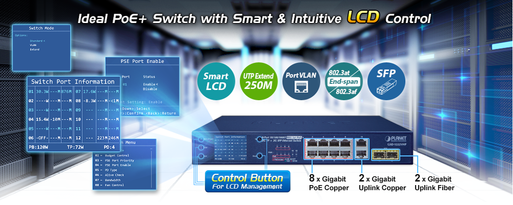 PLANET GSD-1222VHP es una solución ideal de alimentación por Ethernet con solo enchufar y ver que ofrece una instalación rápida, monitoreo del estado de trabajo de PoE en tiempo real y resolución de problemas inmediata a través de su exclusiva pantalla LCD para mejorar la eficiencia y la calidad del trabajo sin necesidad de PC ni software.