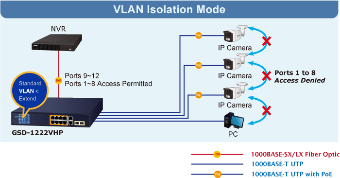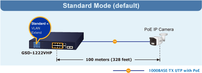 PLANET GSD-1222VHP ofrece modos de operación estándar, VLAN y Extendido. El GSD-1222VHP funciona como un conmutador PoE IEEE 802.3af/at normal en el modo de operación estándar. El modo de operación VLAN presenta la función VLAN basada en puerto que puede ayudar a evitar que la tormenta de multidifusión o difusión de la cámara IP se influya entre sí.