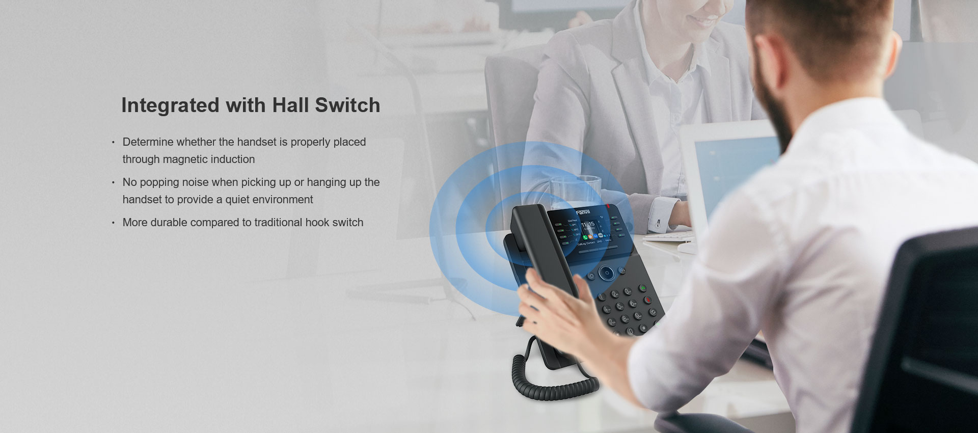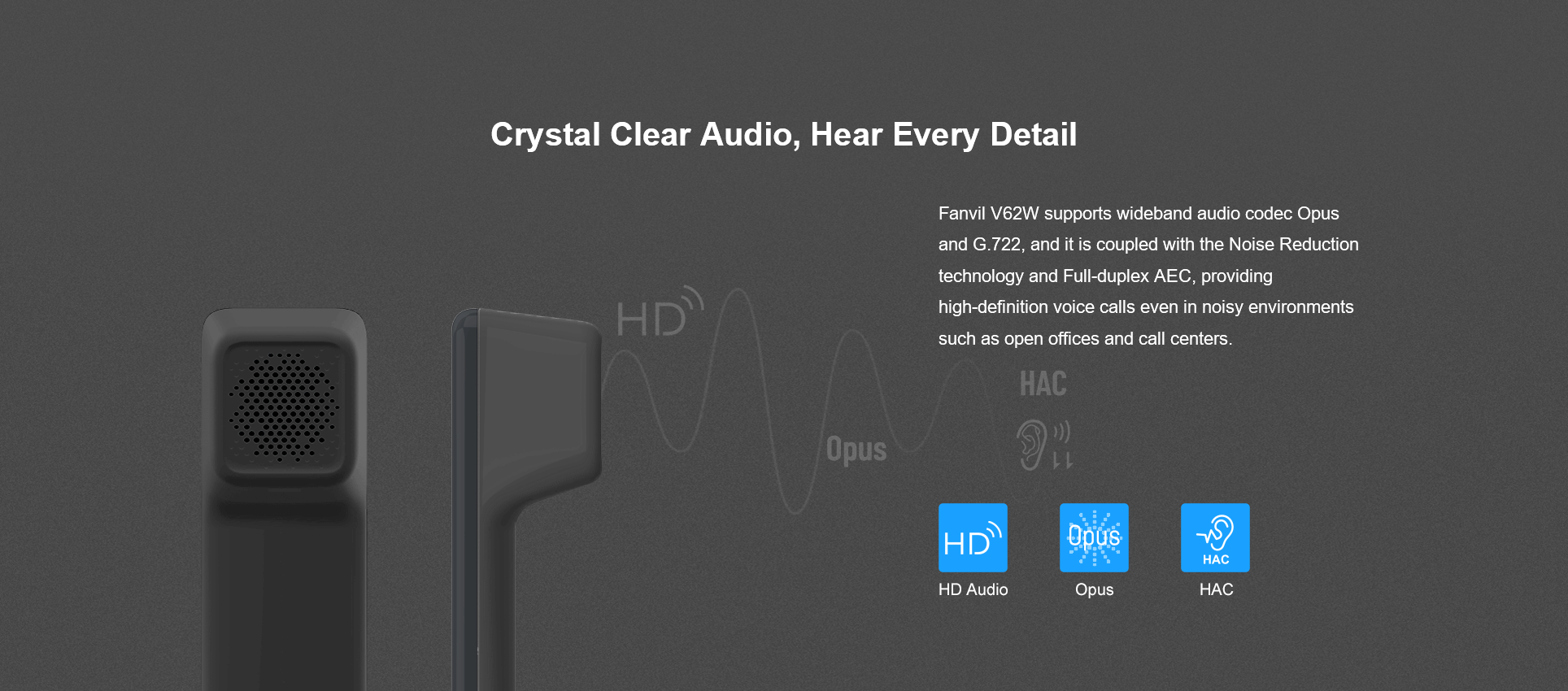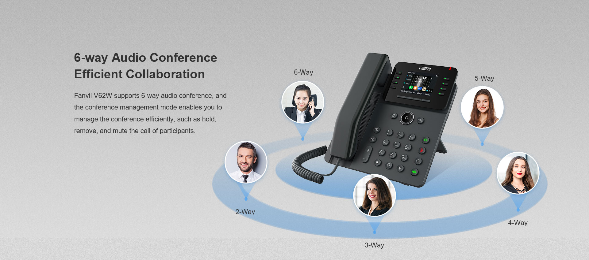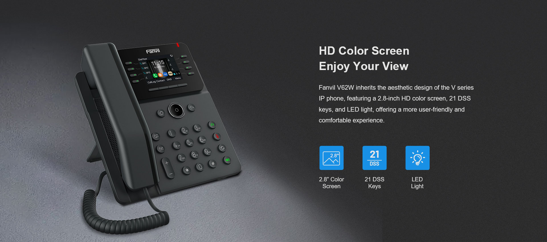 Fanvil V62W es un teléfono IP empresarial elegante y fácil de usar. Cuenta con una pantalla a color de alta definición de 2,8 pulgadas (320x240), admite 12 líneas SIP y permite una conferencia de audio de 6 vías. Con funciones enriquecidas como audio HD, puertos Gigabit duales y Wi-Fi 2.4G / 5G (Wi-Fi 6) y Bluetooth 5.4 incorporados, el V62W es adecuado para varios escenarios de aplicaciones comerciales, brindando a los usuarios una excelente experiencia interactiva y cómodos servicios de comunicación instantánea.