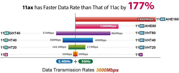 El WDAP-W3000AX de PLANET, que adopta el estándar IEEE 802.11ax Wi-Fi 6, proporciona una transmisión de alta velocidad. La velocidad inalámbrica máxima en la banda de 2,4 GHz es de hasta 574 Mbps con 11ax, y en la banda de 5 GHz es de hasta 2402 Mbps con 11ax. Las conexiones inalámbricas de 2,4 GHz y 5 GHz también se pueden utilizar simultáneamente.