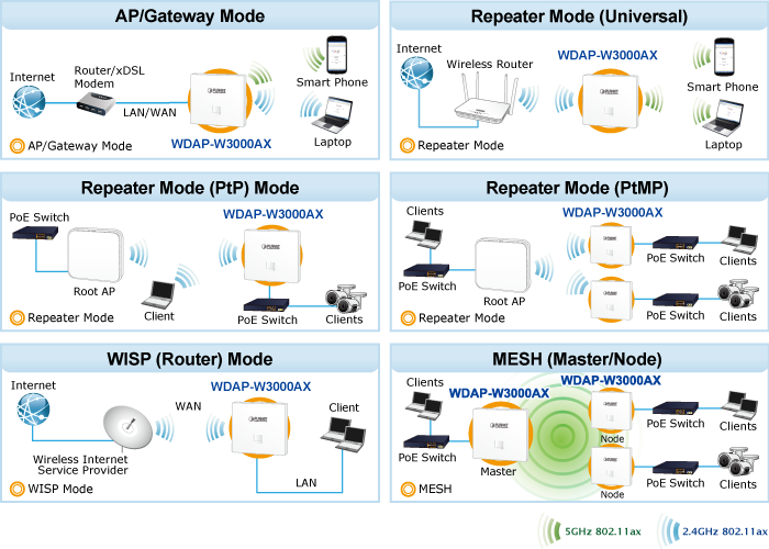El WDAP-W3000AX admite los modos de uso simplificados de AP, Gateway, AP, Repeater y WISP a través de los cuales proporciona más flexibilidad a los usuarios cuando se establece una red inalámbrica. En comparación con los puntos de acceso inalámbricos generales, el WDAP-W3000AX ofrece una capacidad más potente y flexible para los clientes inalámbricos.